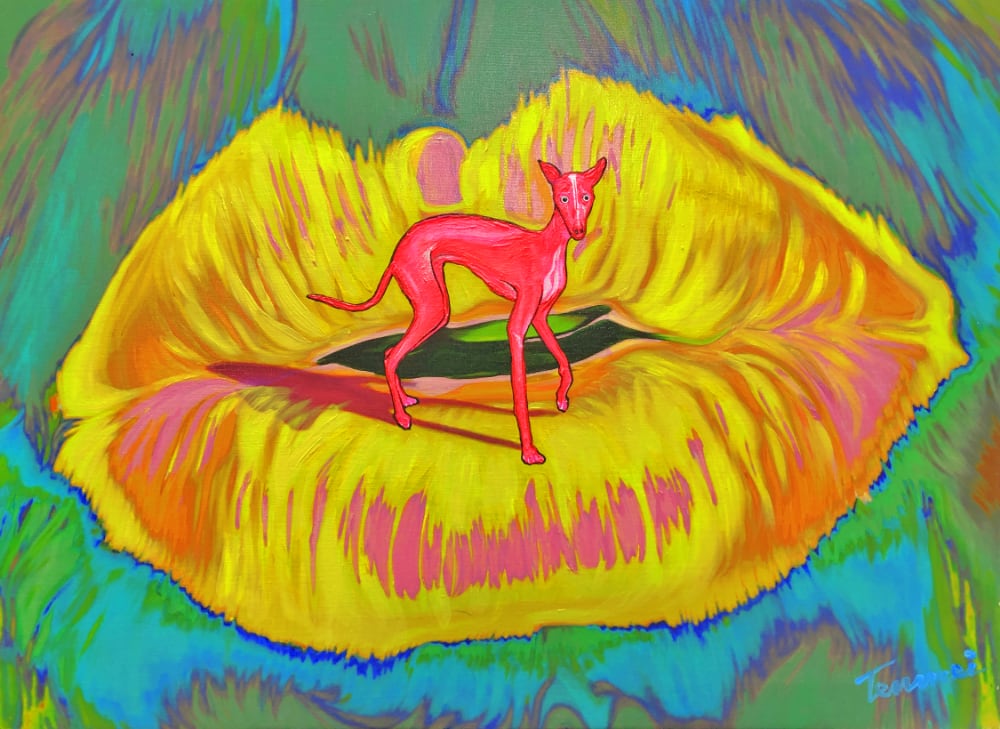 加納典明自身が撮影した写真を元にデジタル効果を施し、アクリル絵具による加筆で仕上げた、オリジナル アート作品。 ★ 人気の『ピンクの犬』シリーズ ★